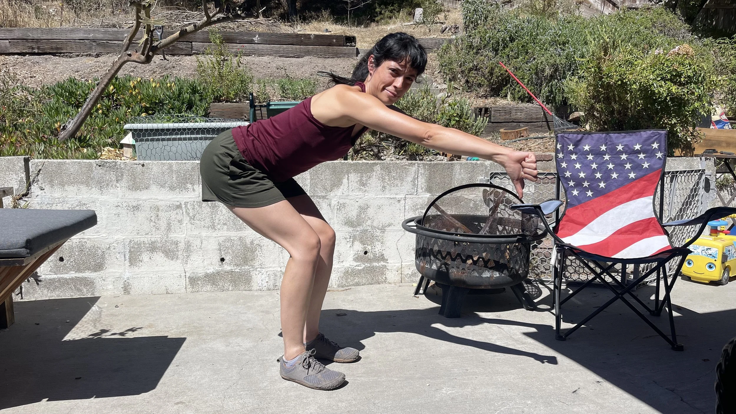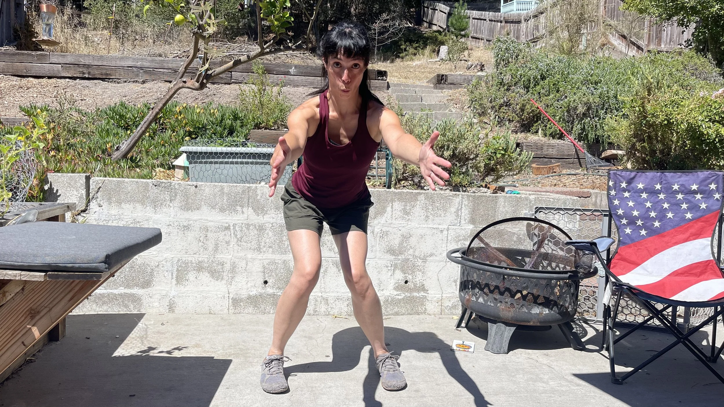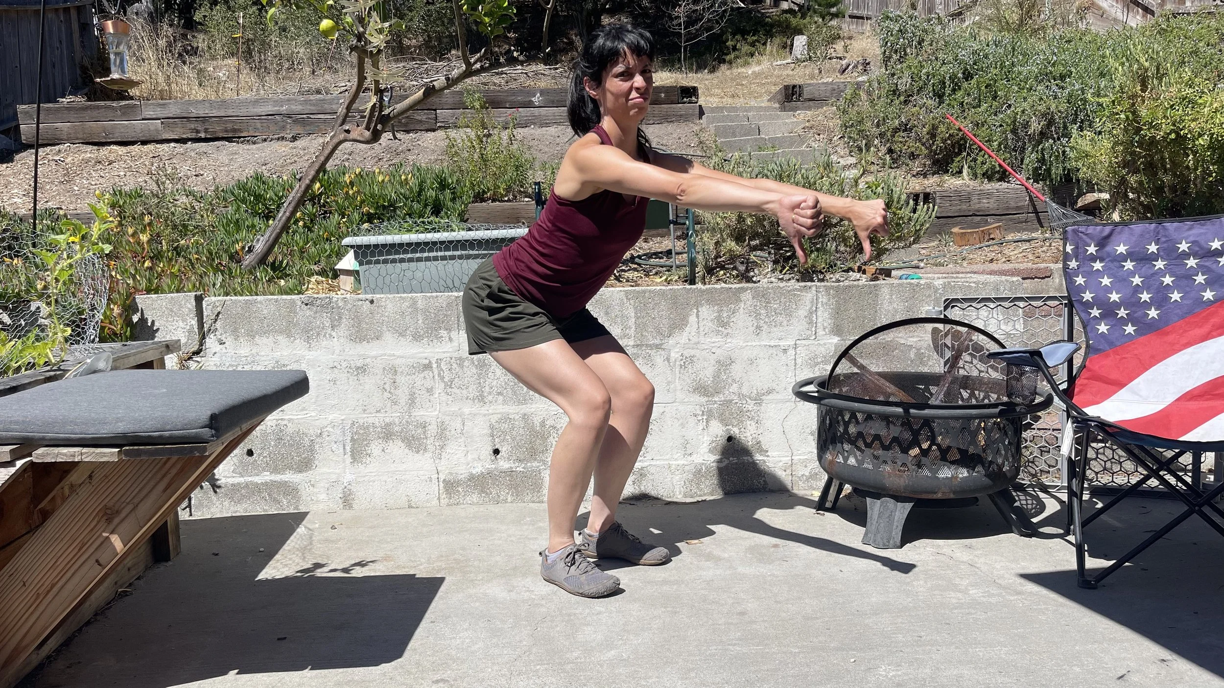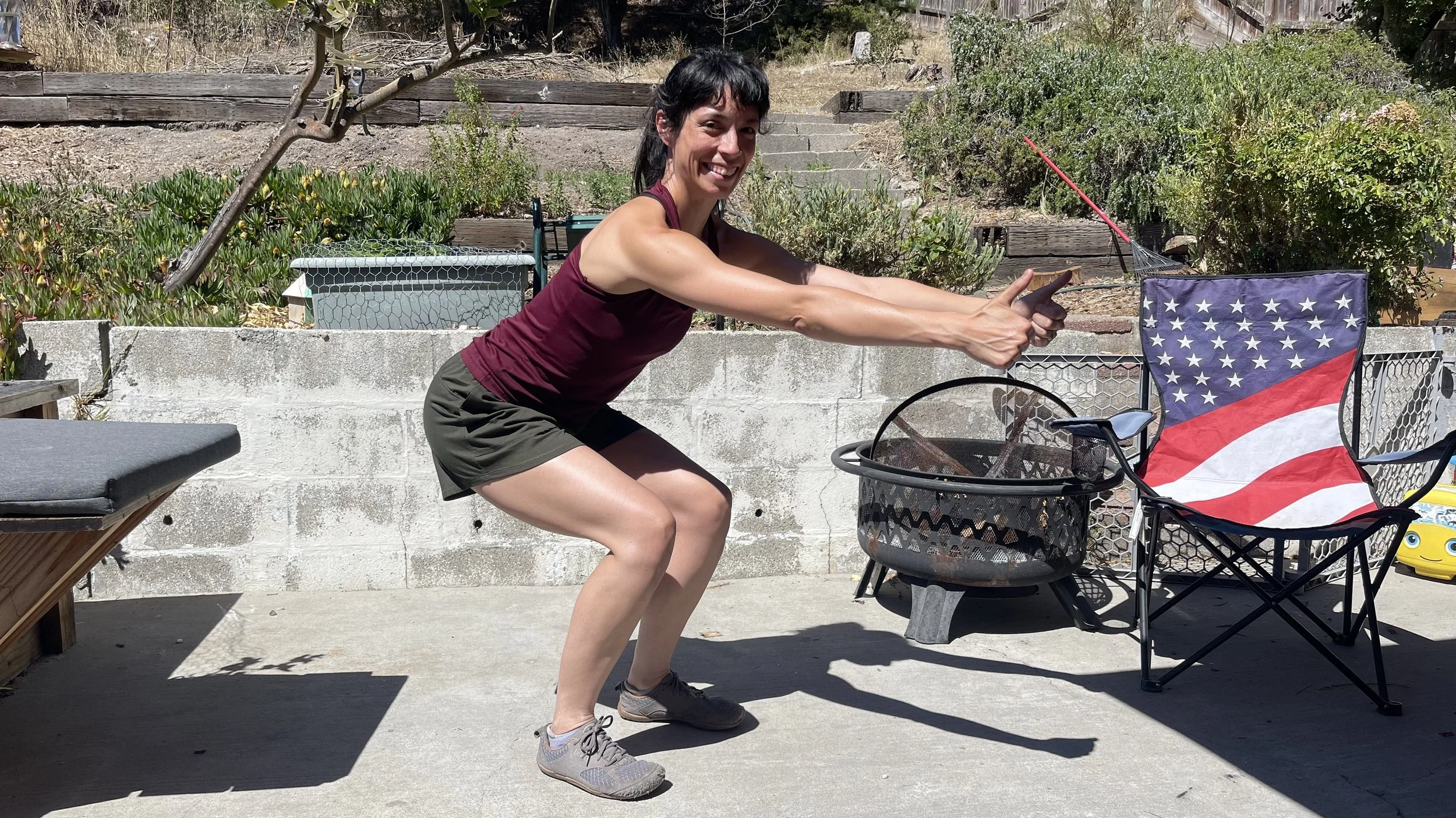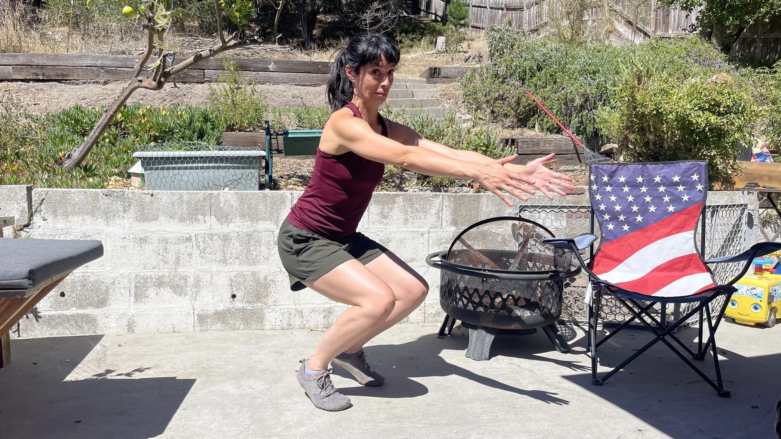 When you’re in your squat, think about: Keeping your chest lifted, finding a hinge from your hips. Try karate chopping right into your hip crease to encourage the movement from there.